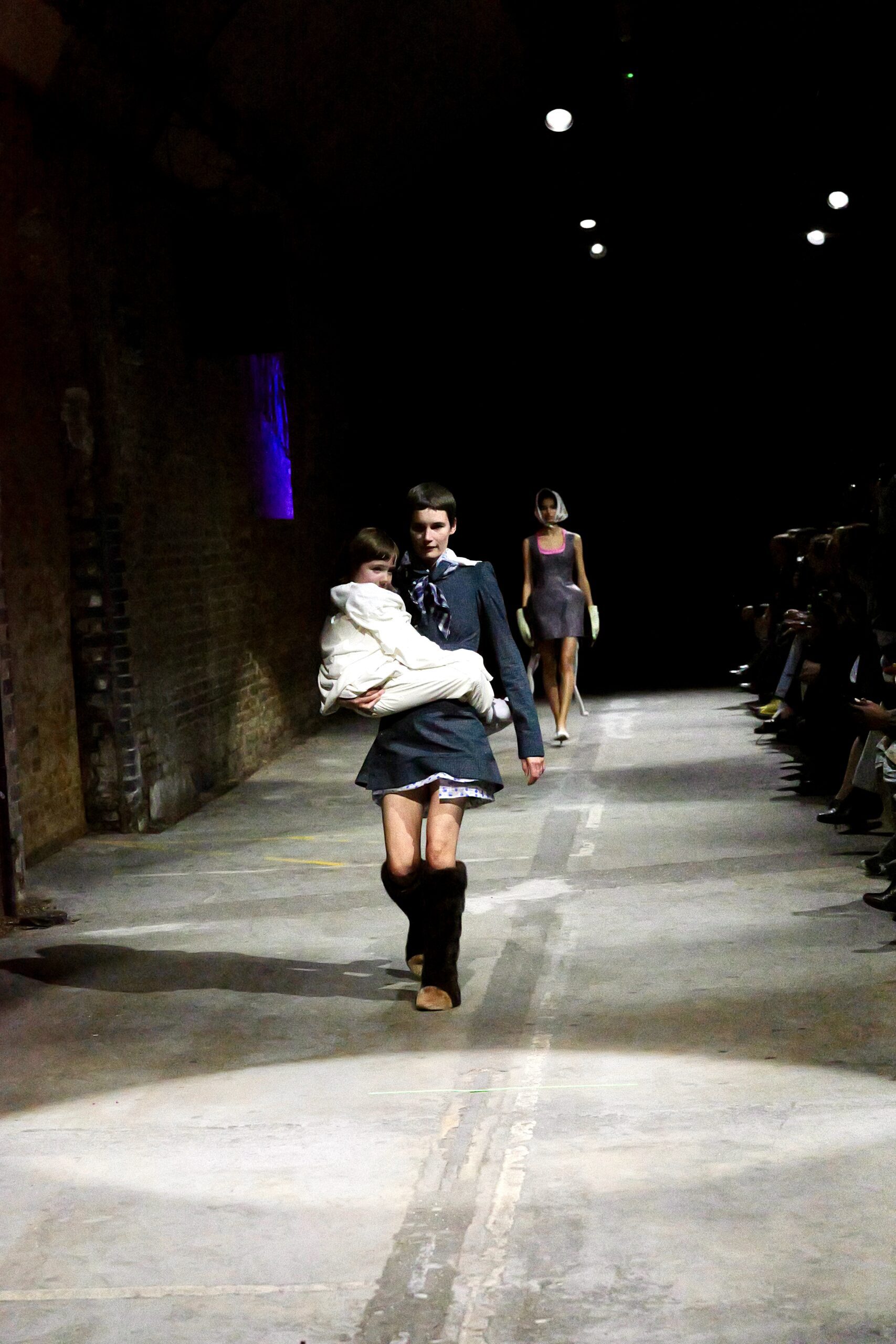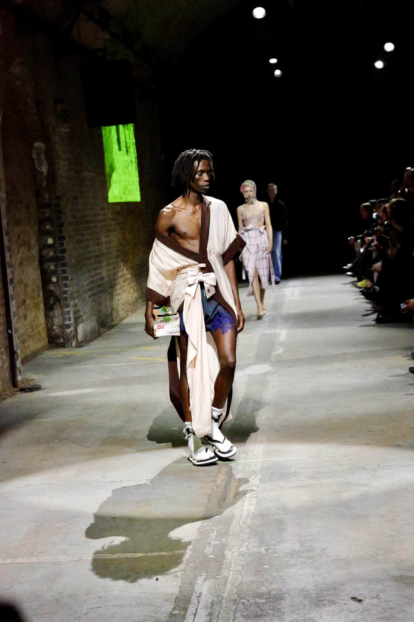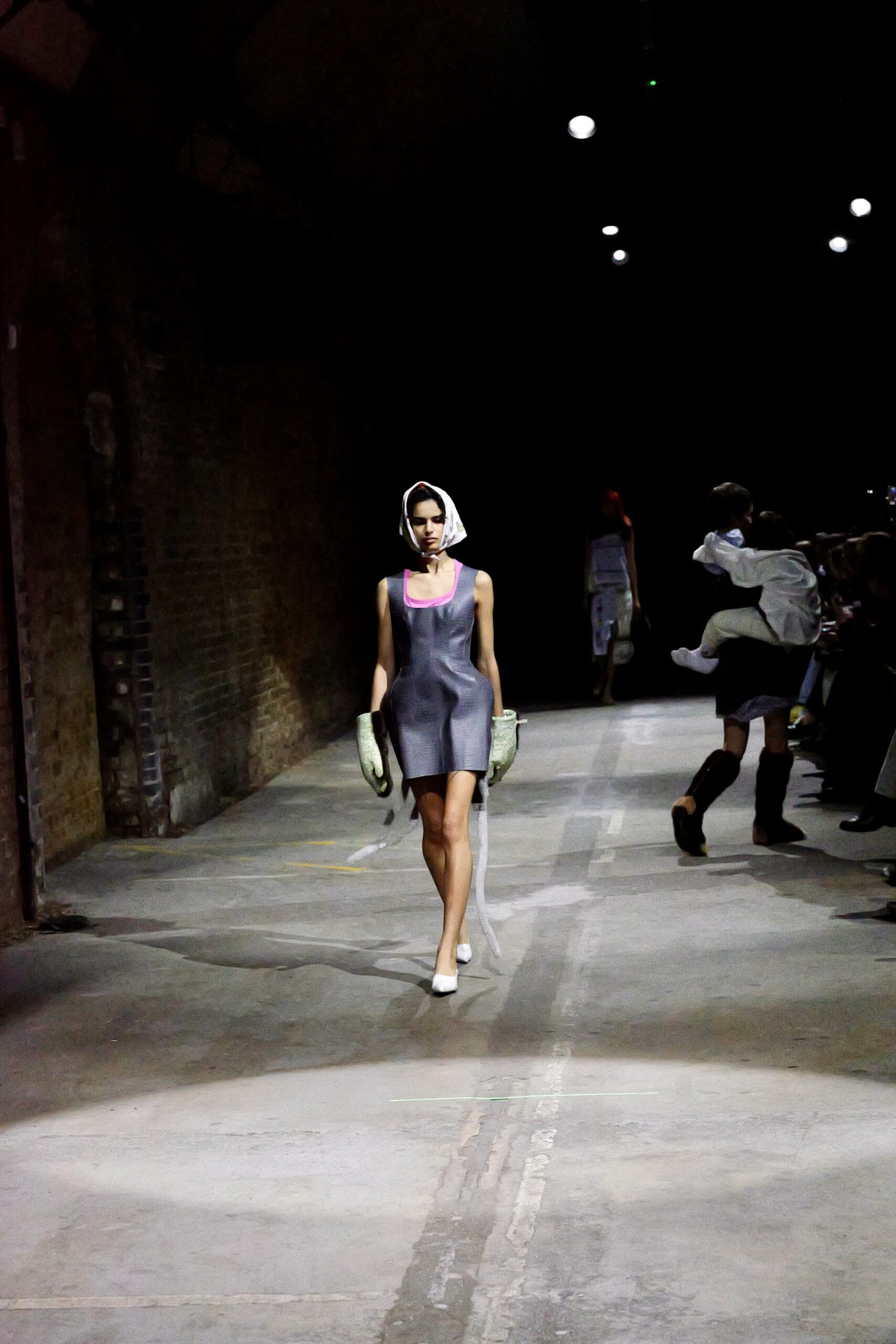 Il y a des défilés que l’on traverse, et d’autres qui s’inscrivent dans la mémoire comme un souvenir de famille. Celui de Natasha Zinko, présenté sous les arches de Waterloo, appartient à cette deuxième catégorie : un moment de mode où l’émotion déborde des silhouettes pour se déposer sur chaque regard, chaque pas, chaque geste. Née en Ukraine et installée à Londres, la créatrice plonge avec « Family Bizness » dans un territoire intime : celui de l’Odesa post-soviétique de son enfance, des marchés saturés de vie, des vêtements qui circulent d’un corps à l’autre. Ici, pas de glamour figé, mais une beauté forgée dans le désordre du quotidien, dans ces minutes volées où l’on s’habille en courant après un enfant, un travail, un rêve.