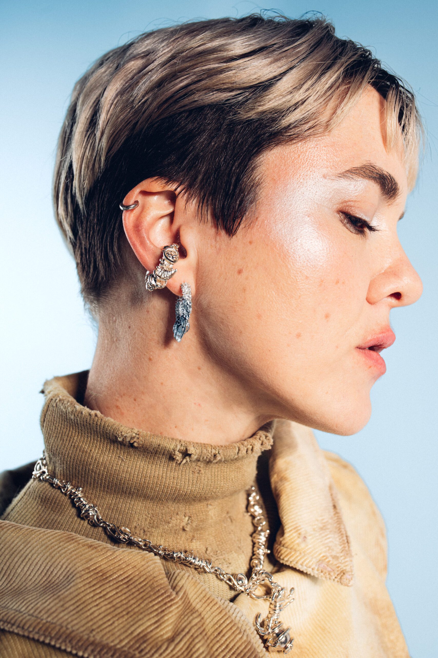 Elle décrit chaque designer : “Aline Amike du Rwanda fait un travail de tressage impressionnant. Zeina travaille sur son héritage arabe en tant que femme dans ces temps difficiles. Niclas Hasemann dont le slogan est ‘on quiet paths’ veut apporter du calme dans ce monde agité. Timo Kurz travaille avec l’upcycling. Carina Lue insère du métal dans de la céramique brisée, c’est très spécifique. Et Zan d’ASTERISK a déjà été porté par A$AP Twigs ou Michèle Lamy.”
