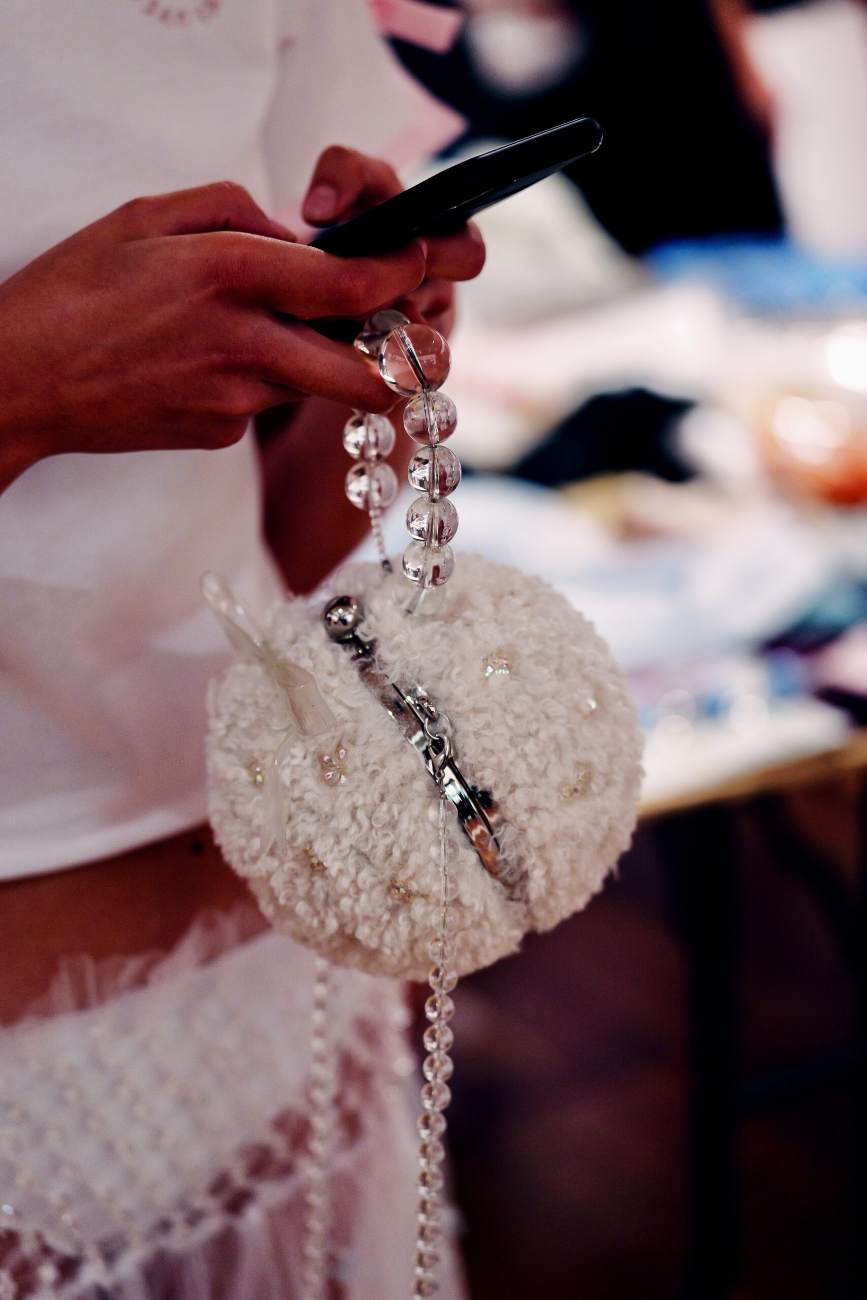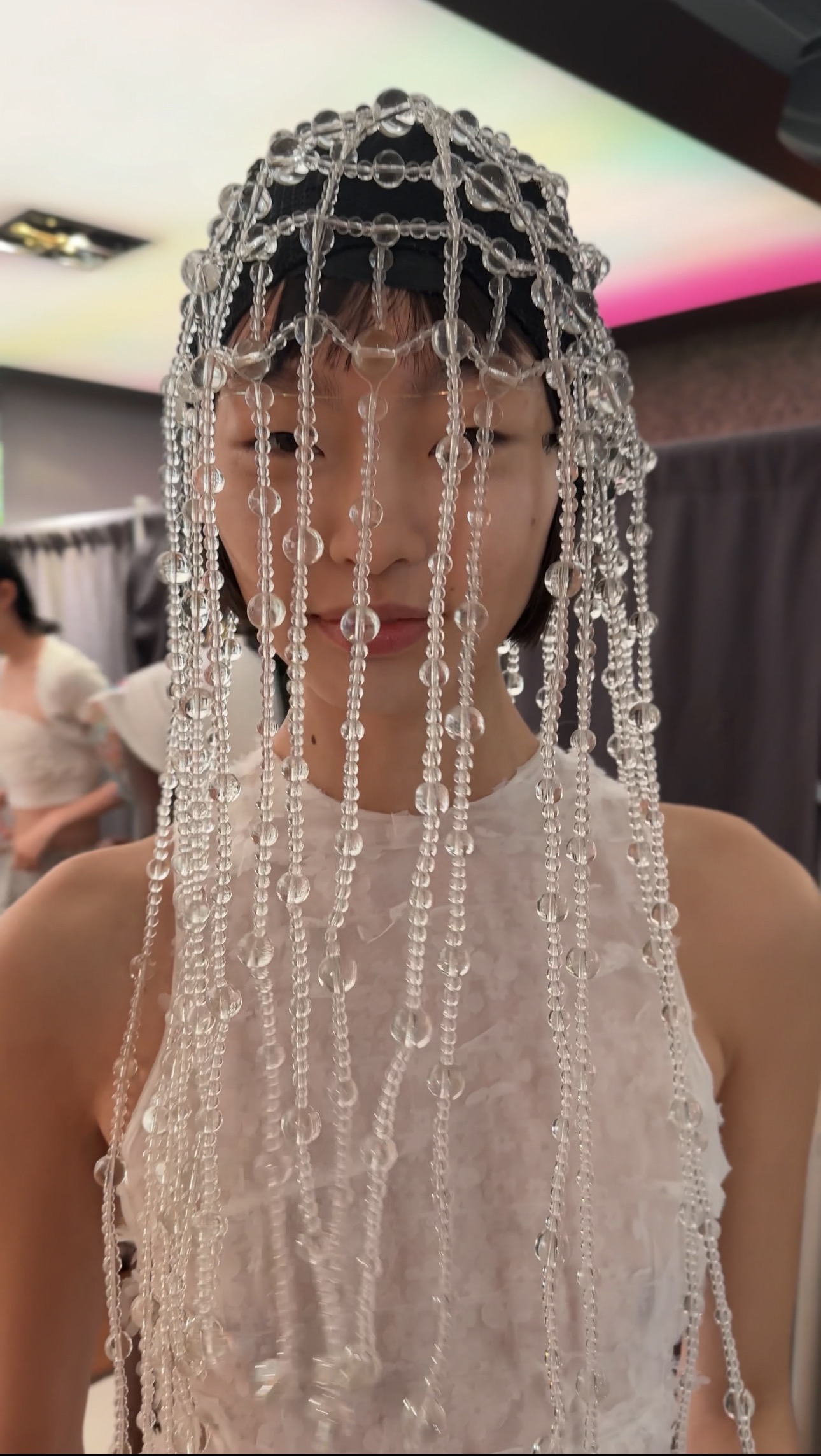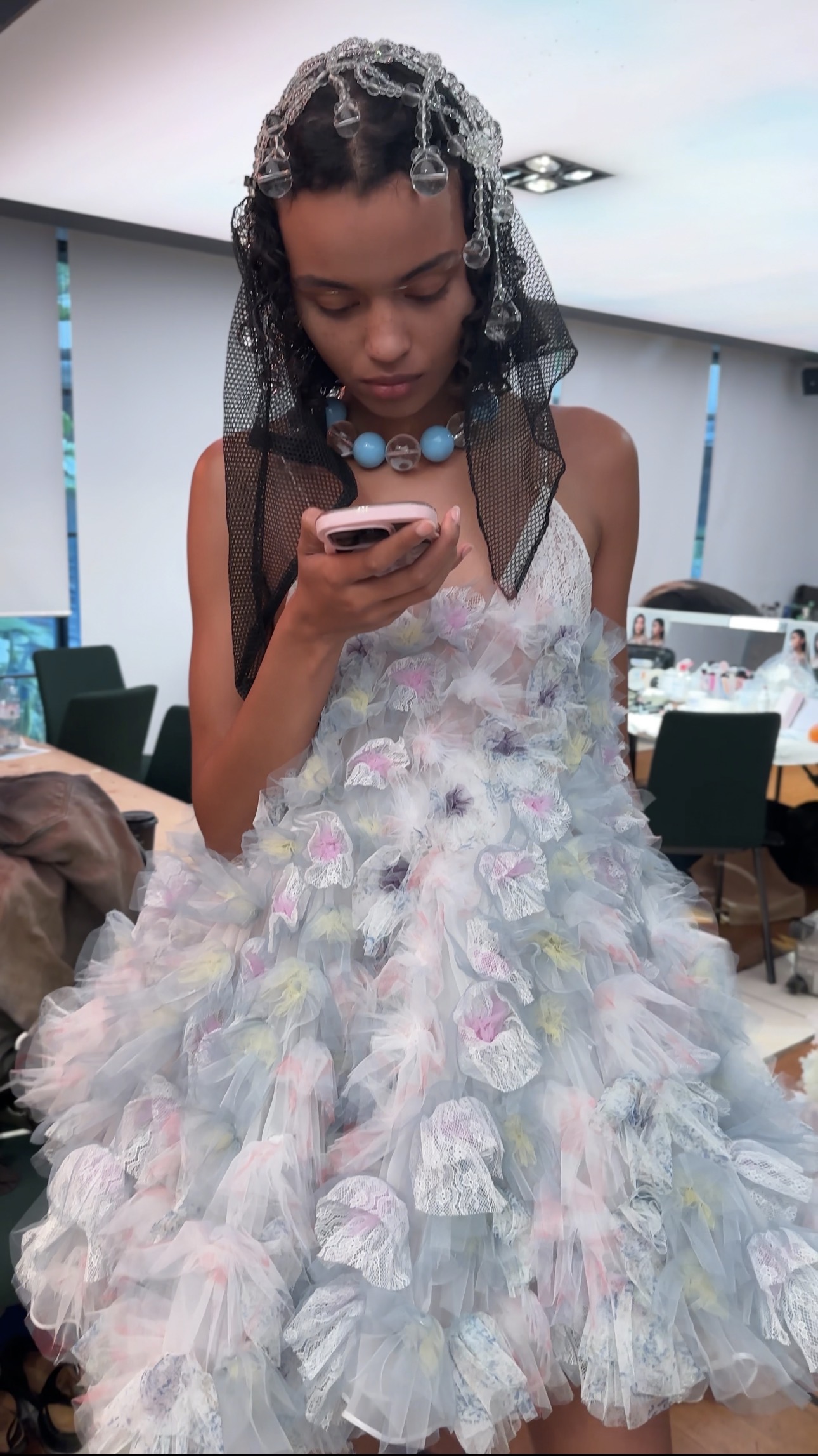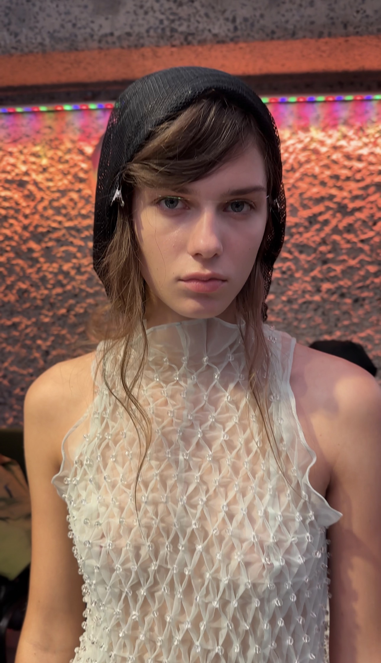 En backstage, la technicité des pièces révèle un savoir-faire exceptionnel. Le « smock à bulles perlées » – quatre mois de perfectionnement – confère une élasticité organique aux matières. Les perles forment des motifs scintillants sur des robes transparentes d’une fluidité hypnotique.