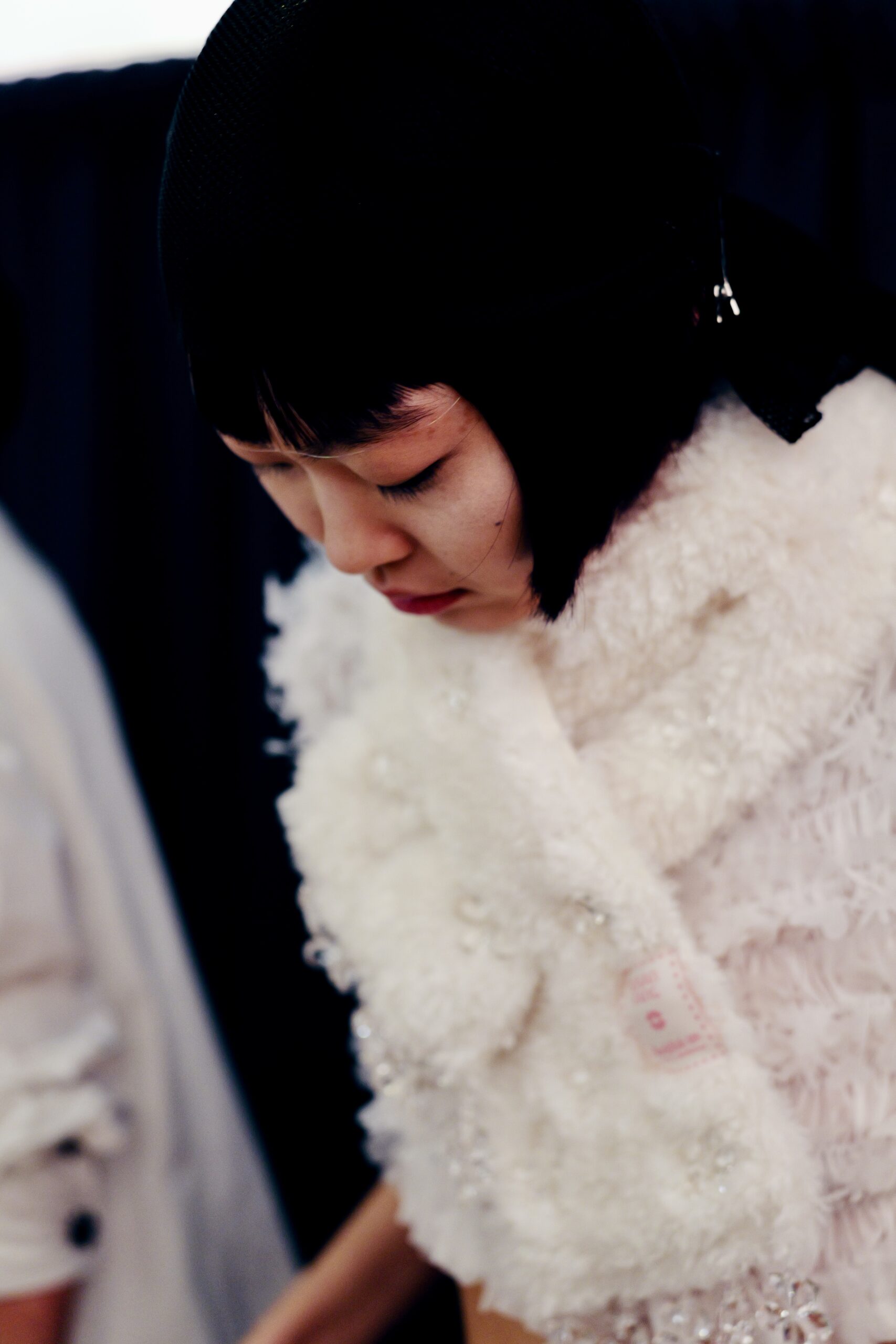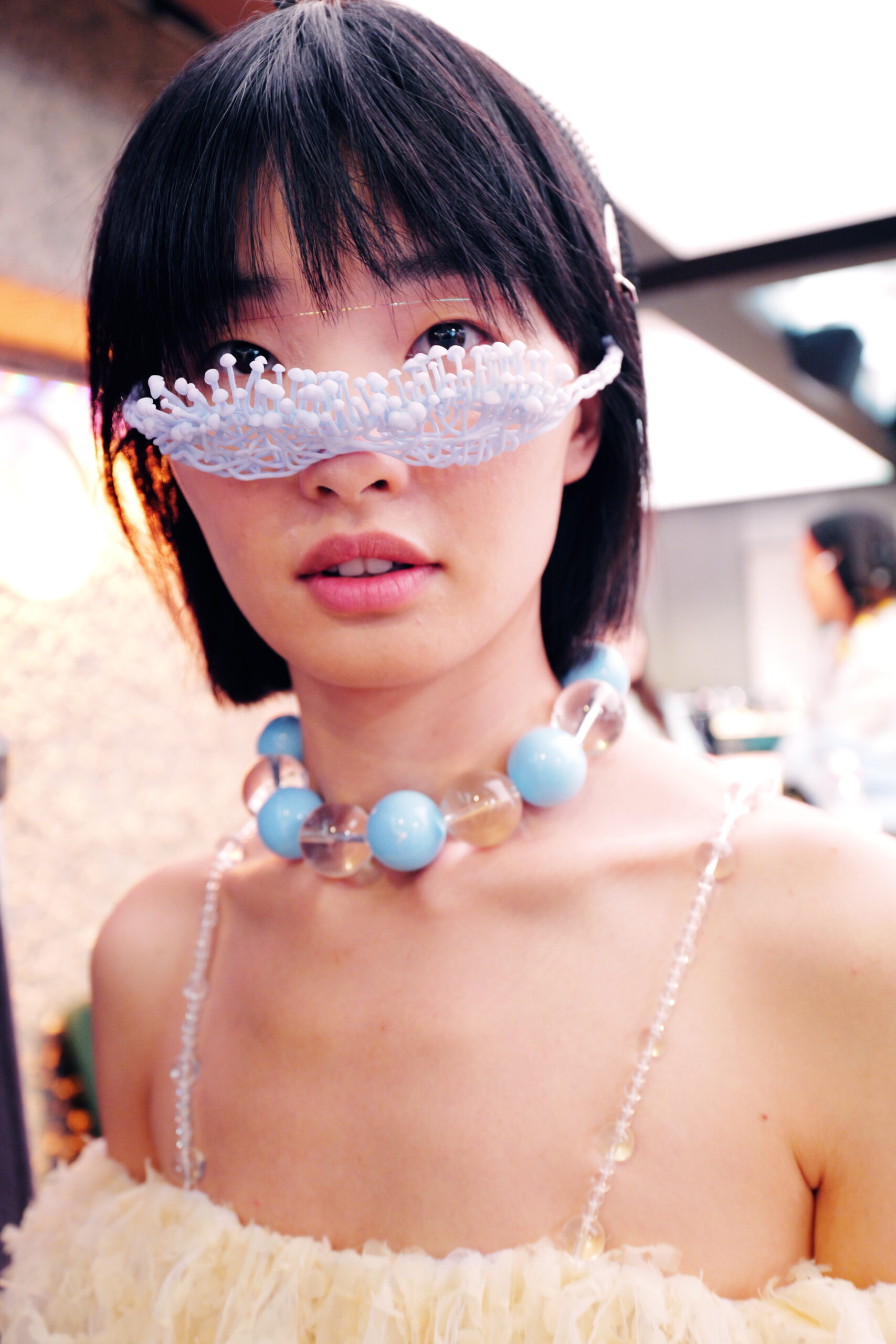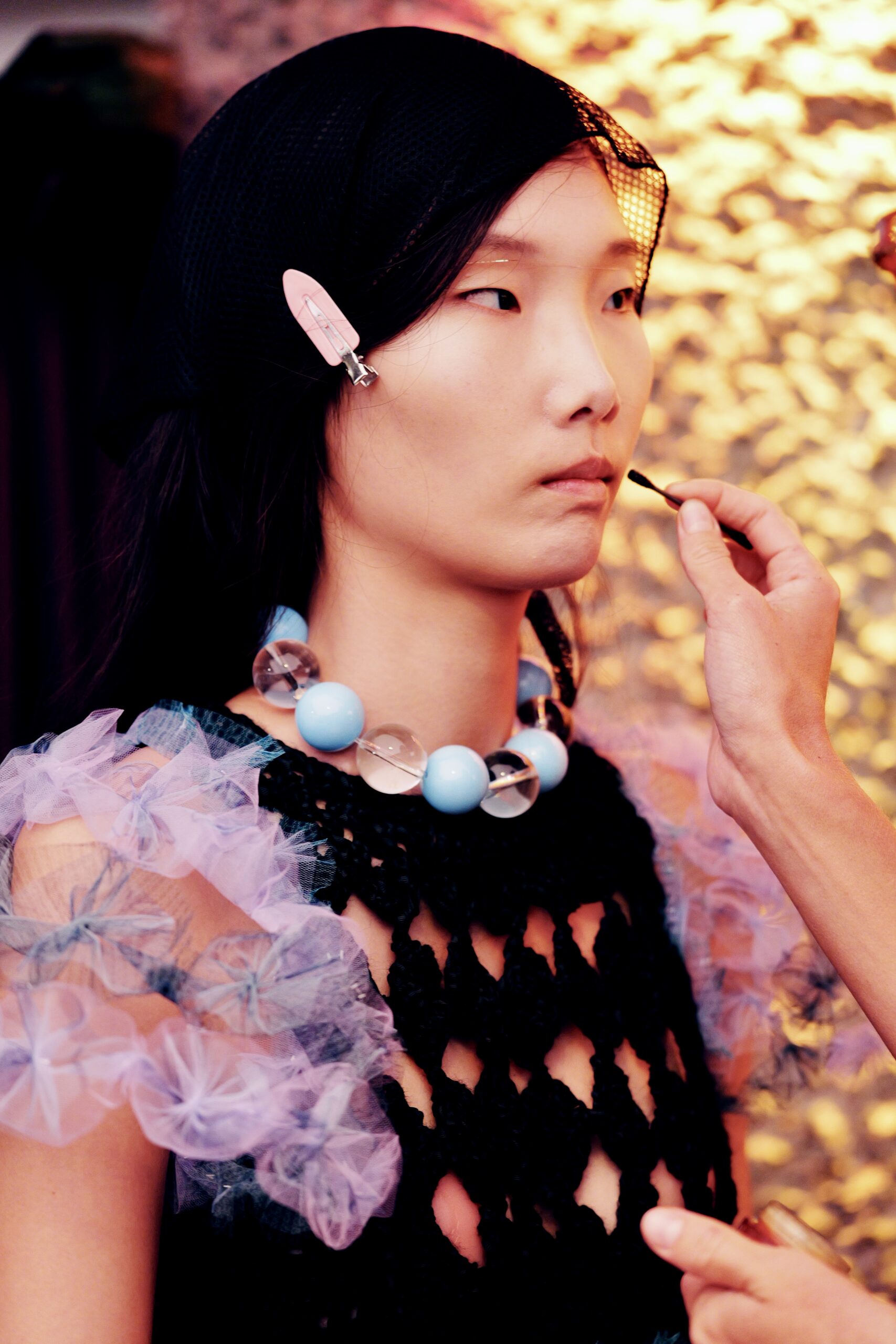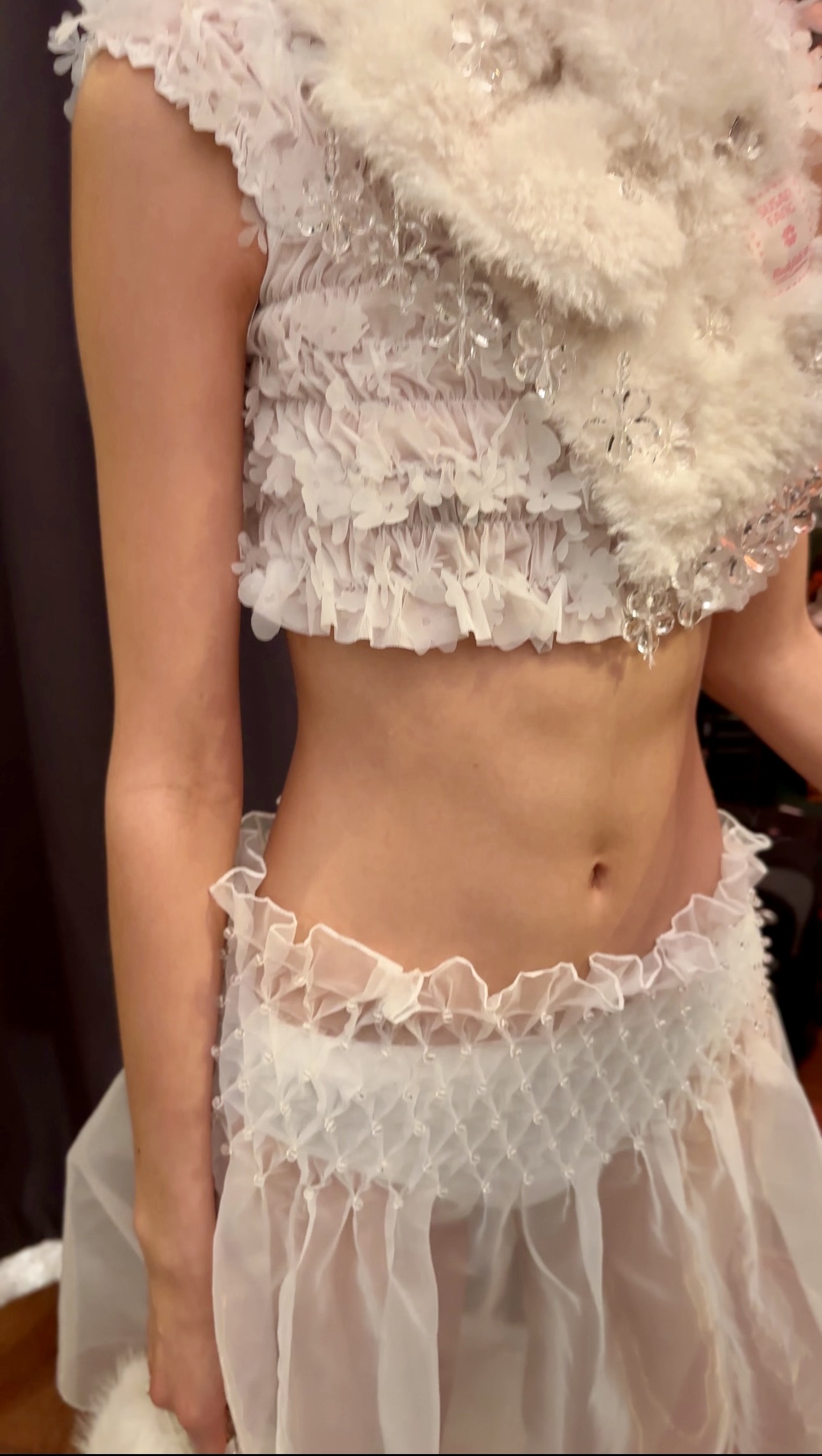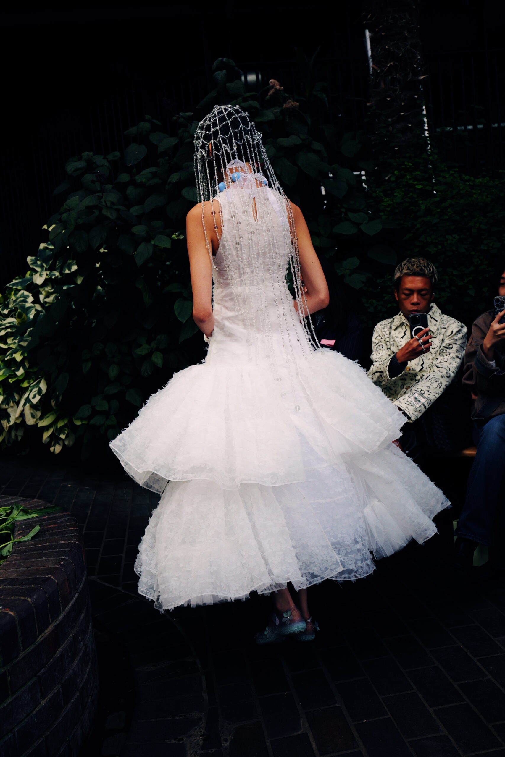 En backstage, la technicité des pièces révèle un savoir-faire exceptionnel. Le « smock à bulles perlées » – quatre mois de perfectionnement – confère une élasticité organique aux matières. Les perles forment des motifs scintillants sur des robes transparentes d’une fluidité hypnotique.