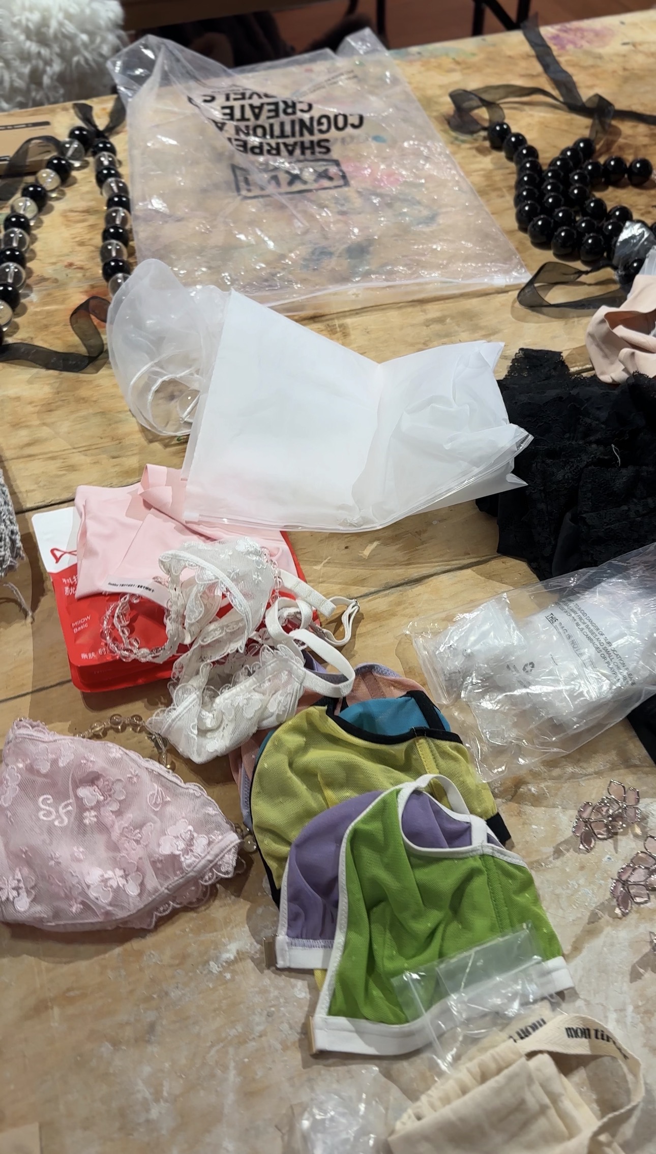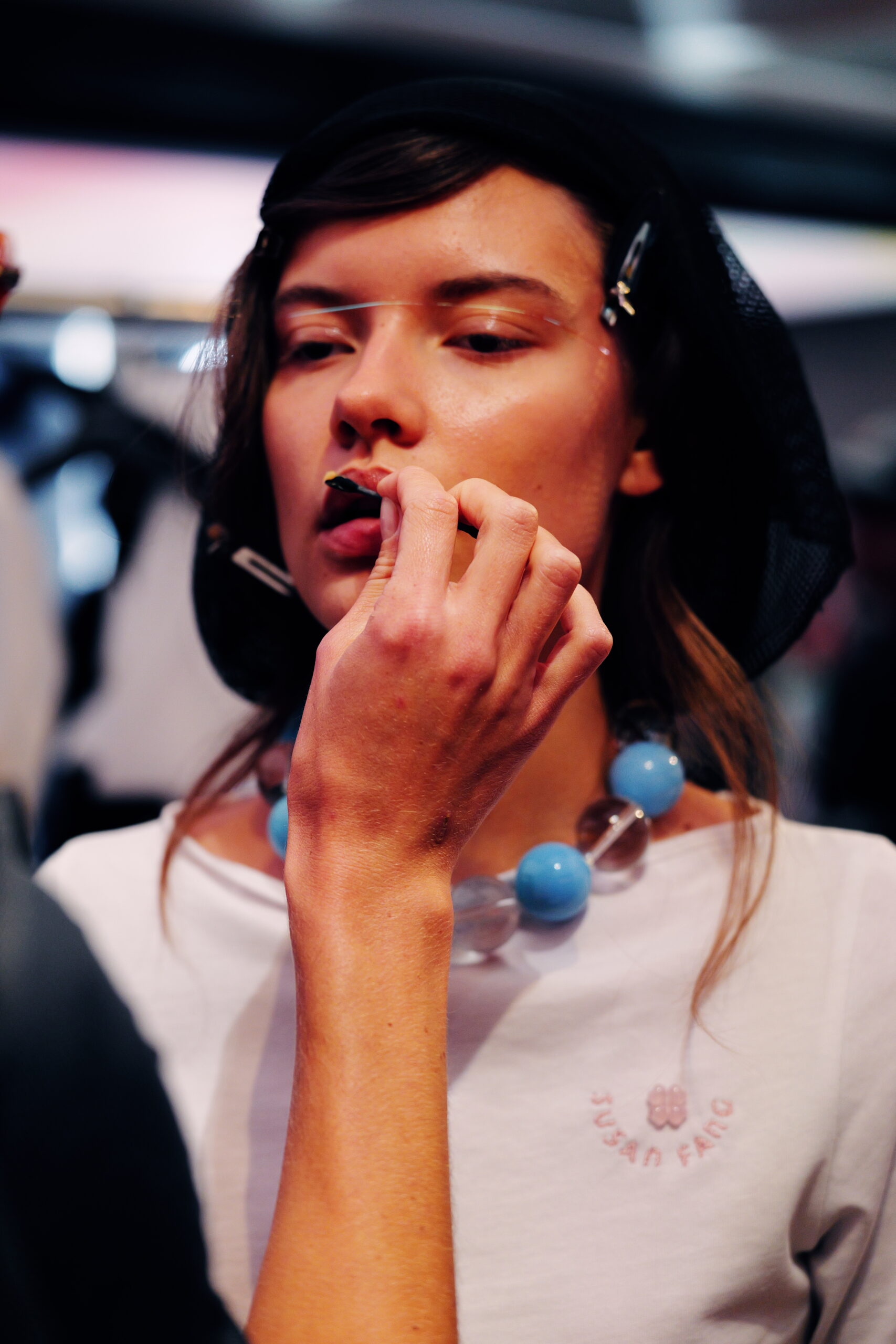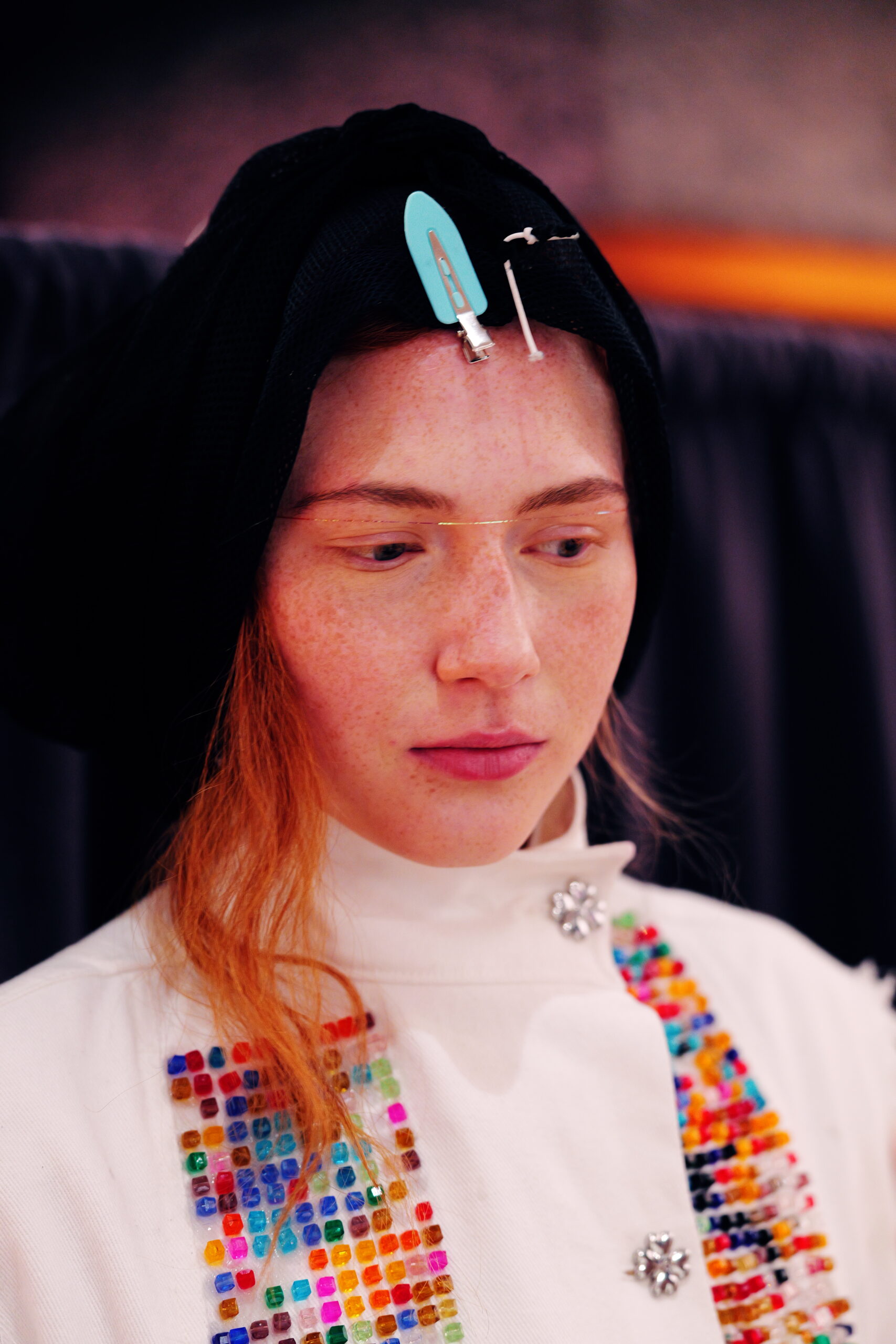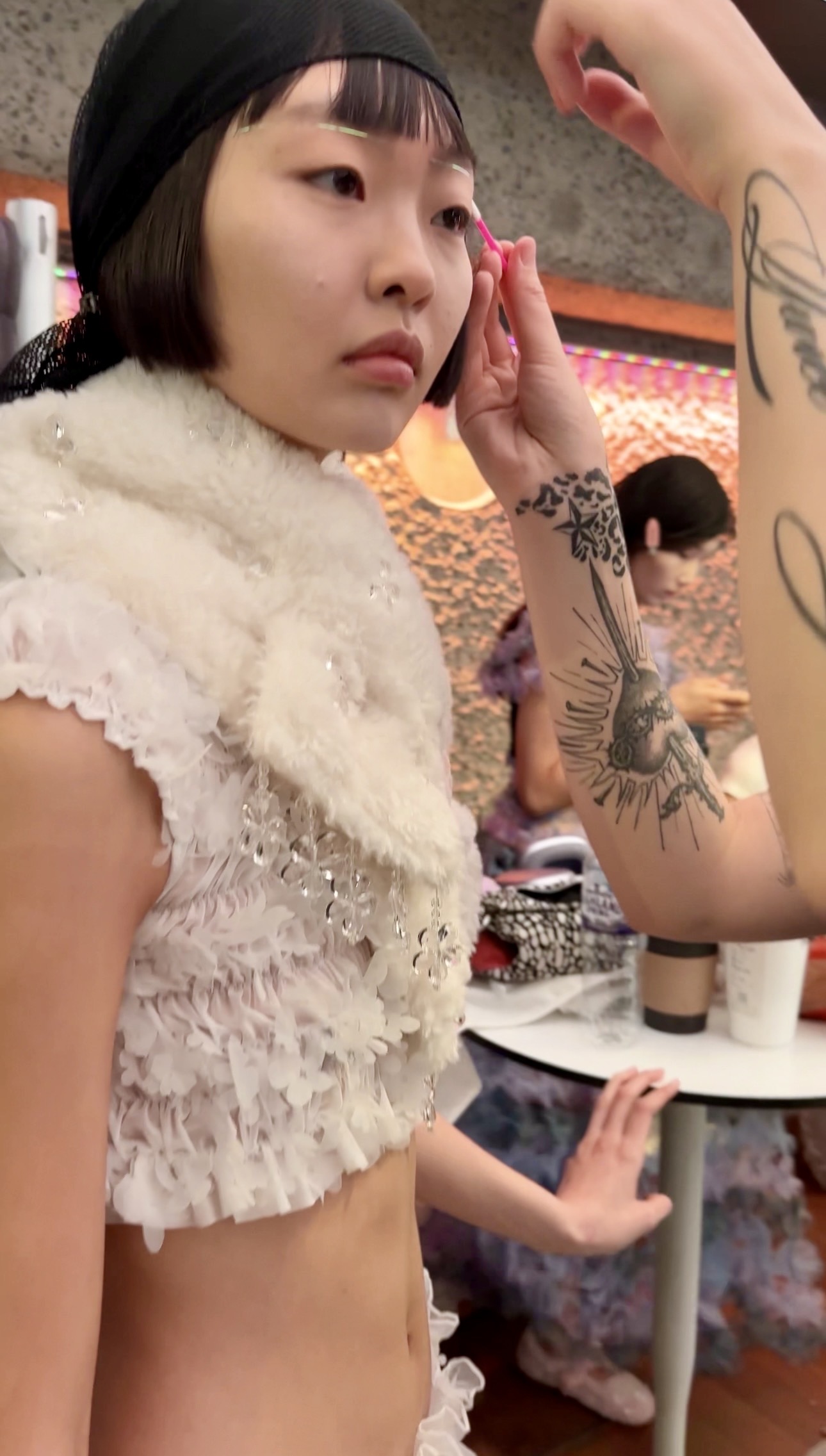 En backstage, la technicité des pièces révèle un savoir-faire exceptionnel. Le « smock à bulles perlées » – quatre mois de perfectionnement – confère une élasticité organique aux matières. Les perles forment des motifs scintillants sur des robes transparentes d’une fluidité hypnotique.