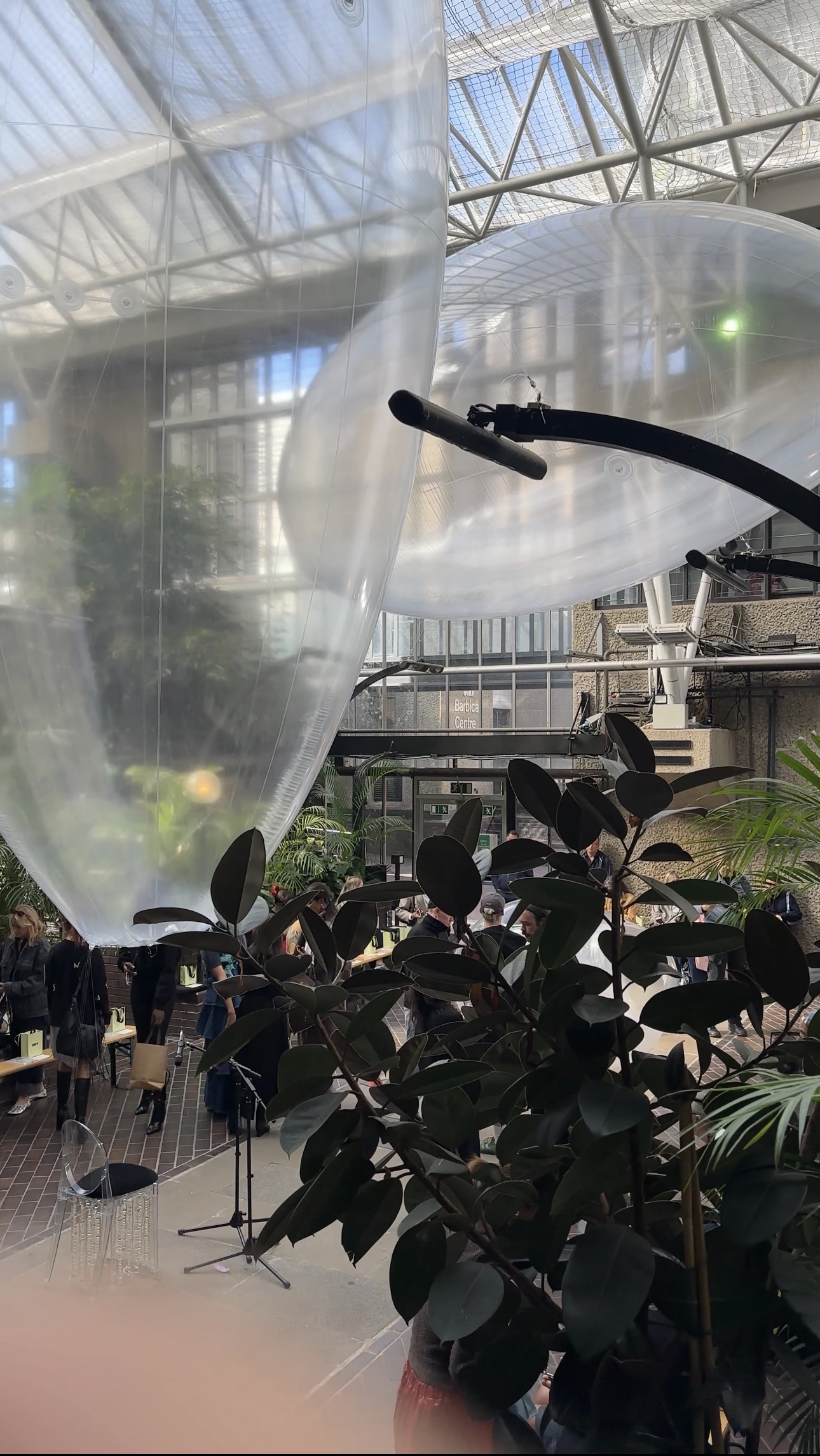 Le choix du lieu n’est pas anodin. « Le Barbican est vraiment parfait car son architecture est très futuriste, mais il y a tellement de verdure », explique Susan. Un équilibre s’établit, propice à son histoire. Les immenses installations de bulles – véritables vaisseaux spatiaux suspendus – interagissent avec le narratif, créant une atmosphère onirique entre béton brutaliste et jungle tropicale.