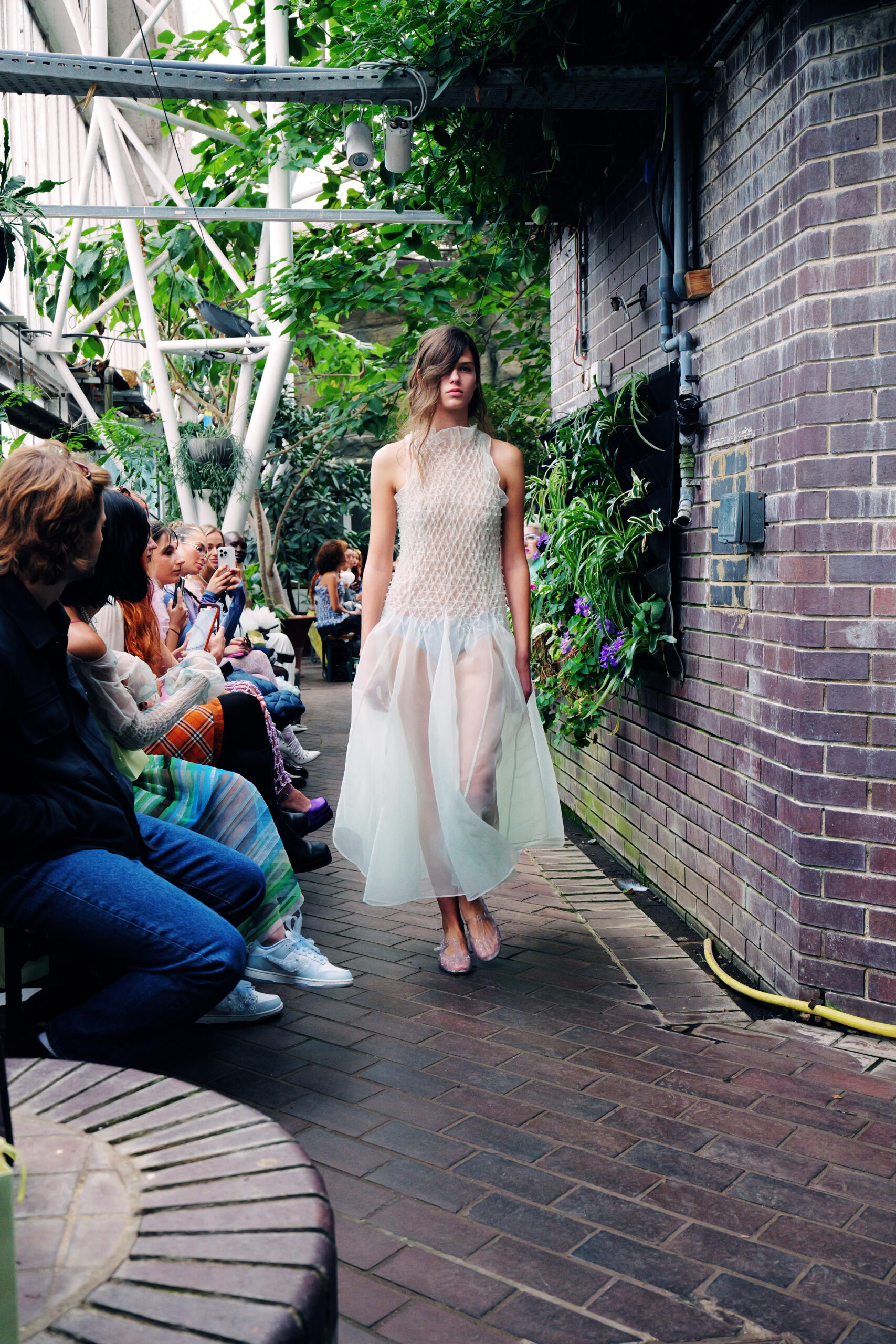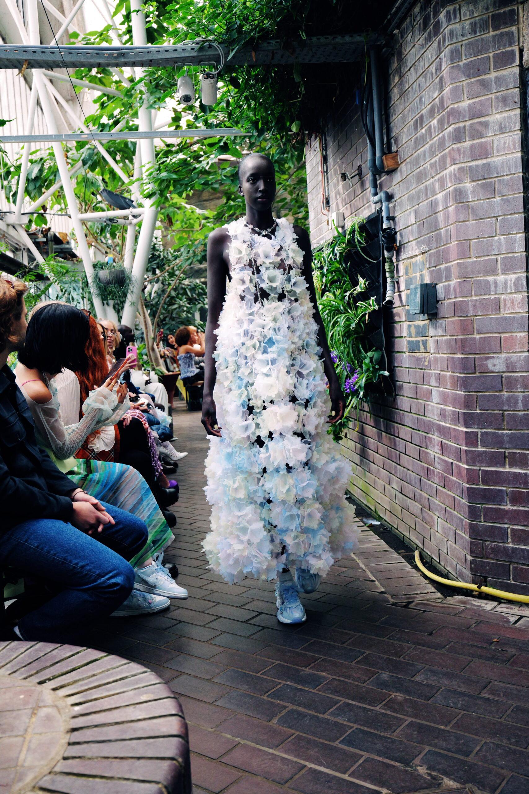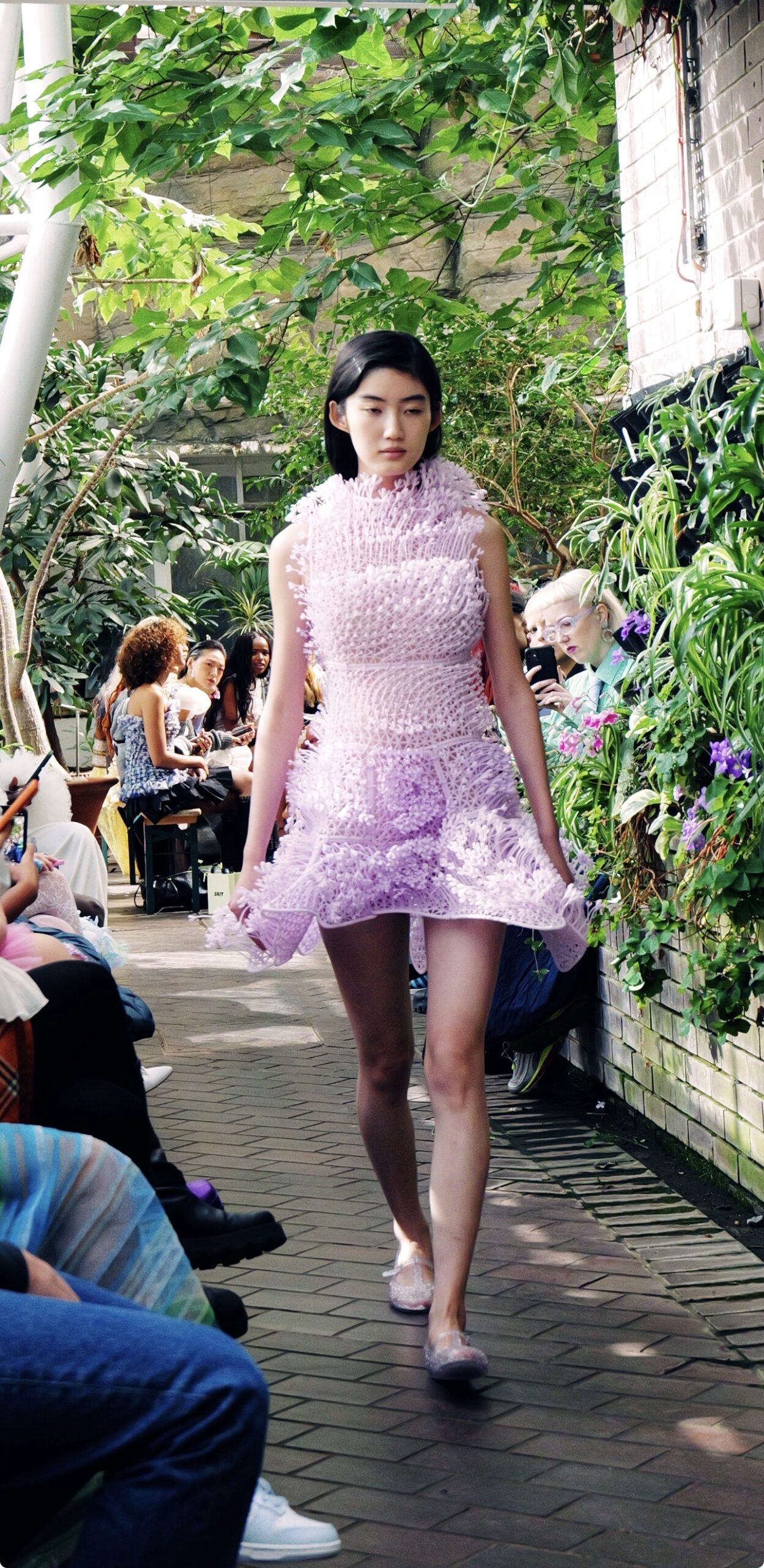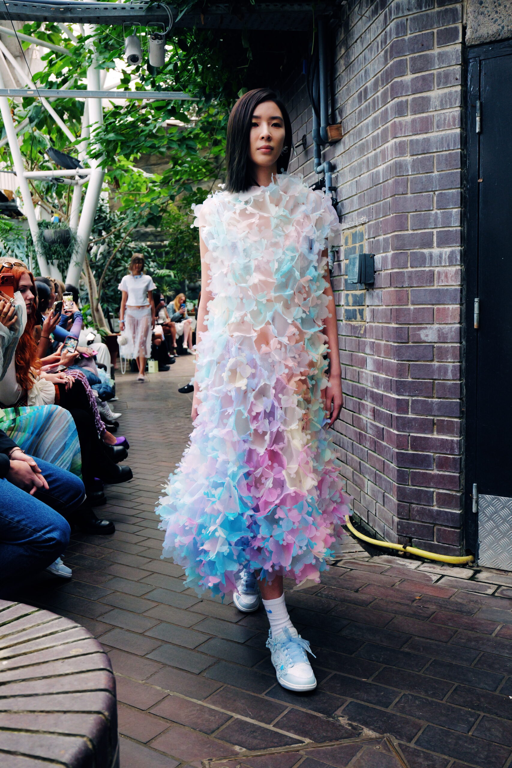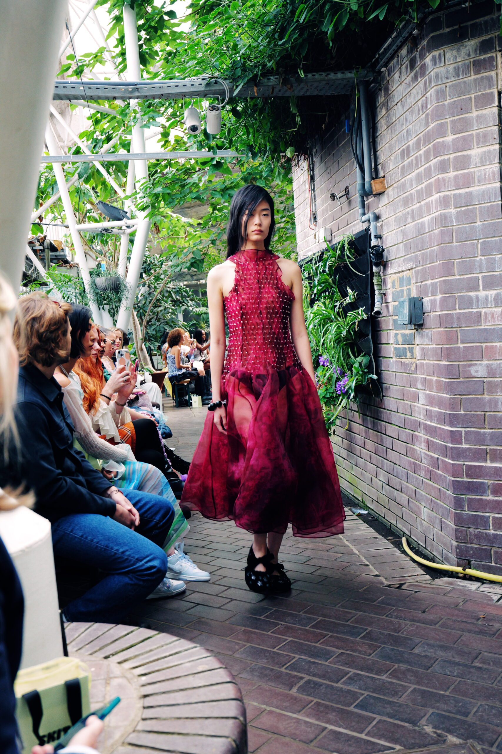 Dans la serre luxuriante du Barbican Conservatory, la créatrice sino-britannique nous transporte dans le futur : innovation textile et vision futuriste sont les maîtres-mots.