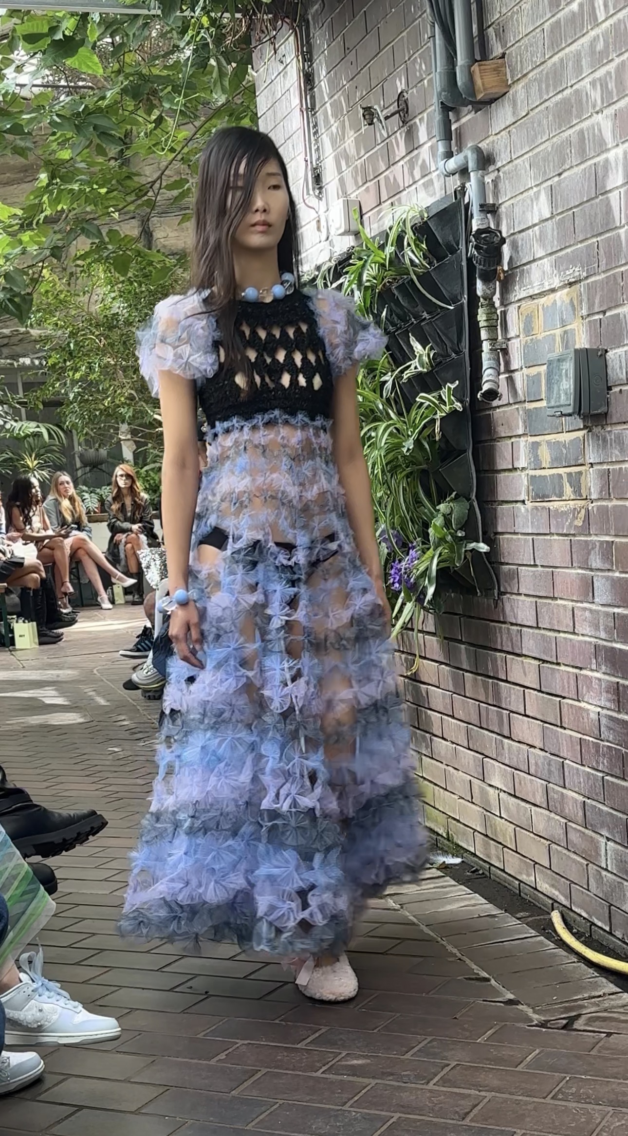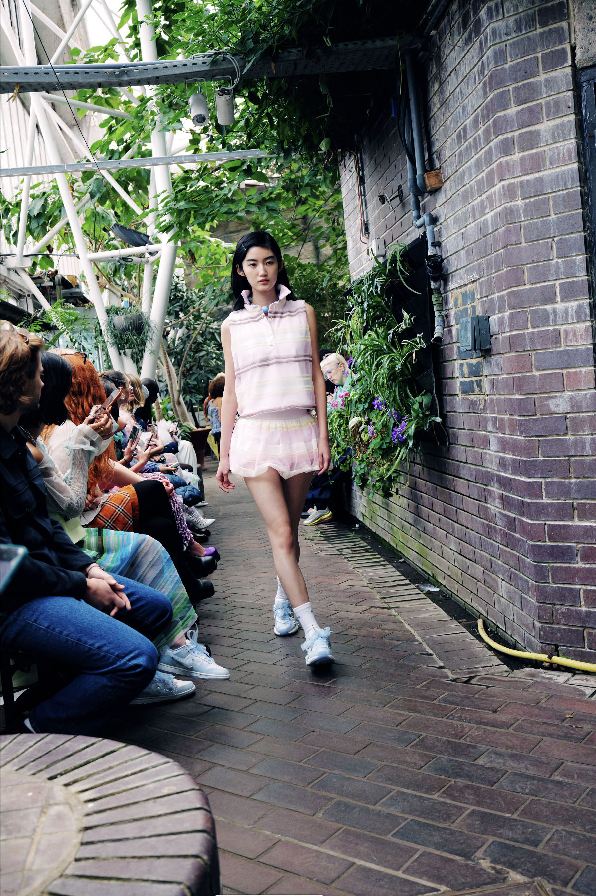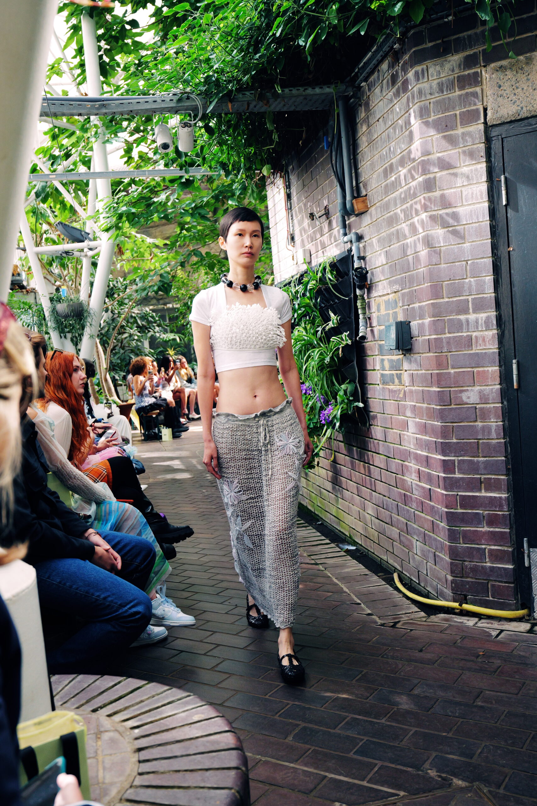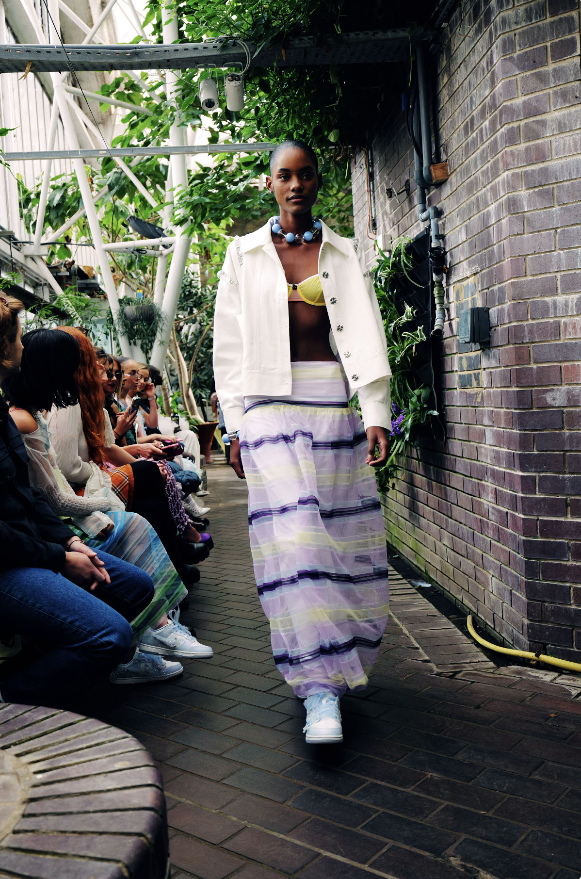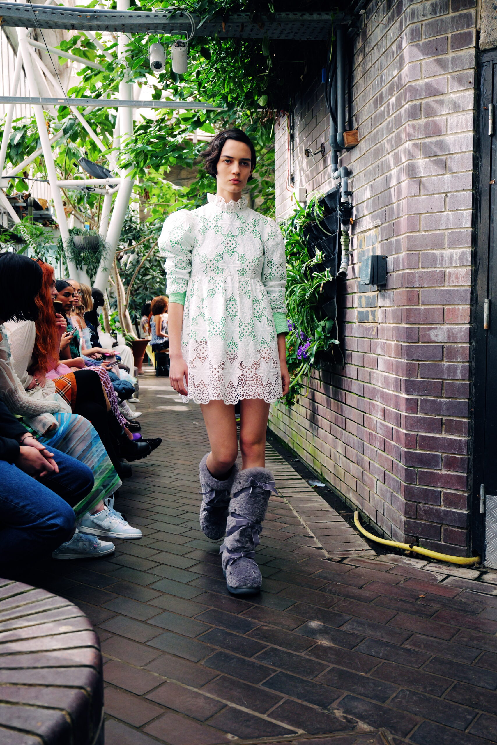Dans la serre luxuriante du Barbican Conservatory, la créatrice sino-britannique nous transporte dans le futur : innovation textile et vision futuriste sont les maîtres-mots.