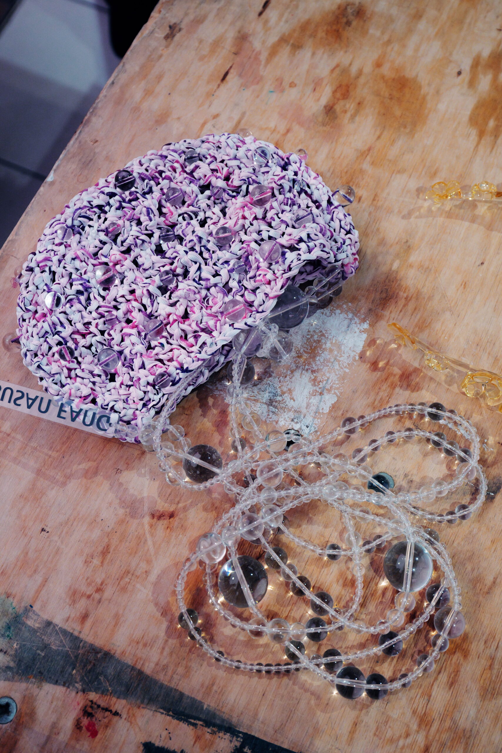 Le résultat est remarquable et fascinant : champignons imprimés en 3D, structures coraliennes devenues sacs et lunettes, robe violette hypnotique. L’ancien ingénieur de Dyson utilise la simulation informatique pour « cultiver » numériquement ces formes organiques, créant une alchimie rare entre rigueur technique et poésie textile.