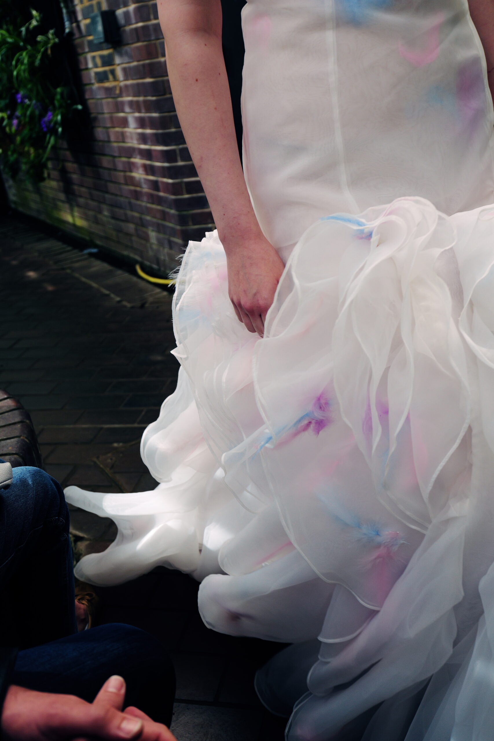 Le « puzzle aérien », où des pièces circulaires inspirées du corail s’assemblent en patchworks tridimensionnels, génère des volumes qui ondulent au moindre mouvement. Les broderies de plumes aux dégradés pastel, les superpositions d’organza et de tulle révèlent une sophistication digne de la haute couture.