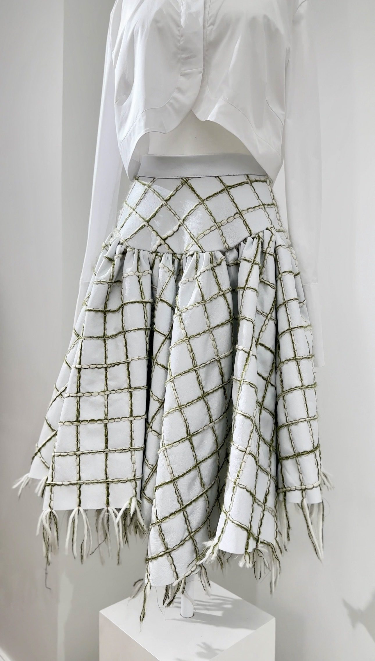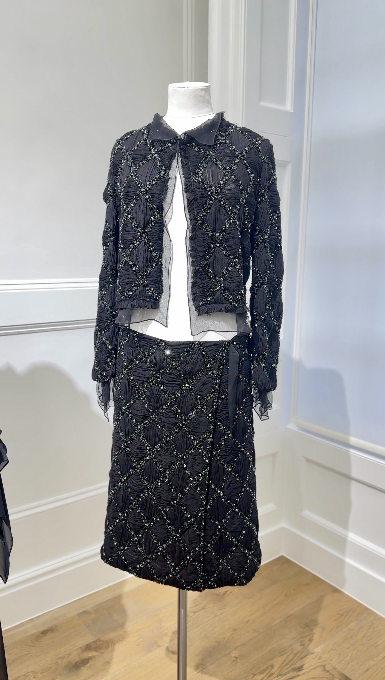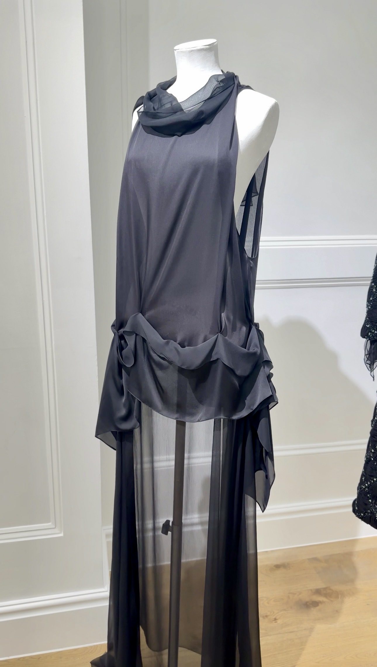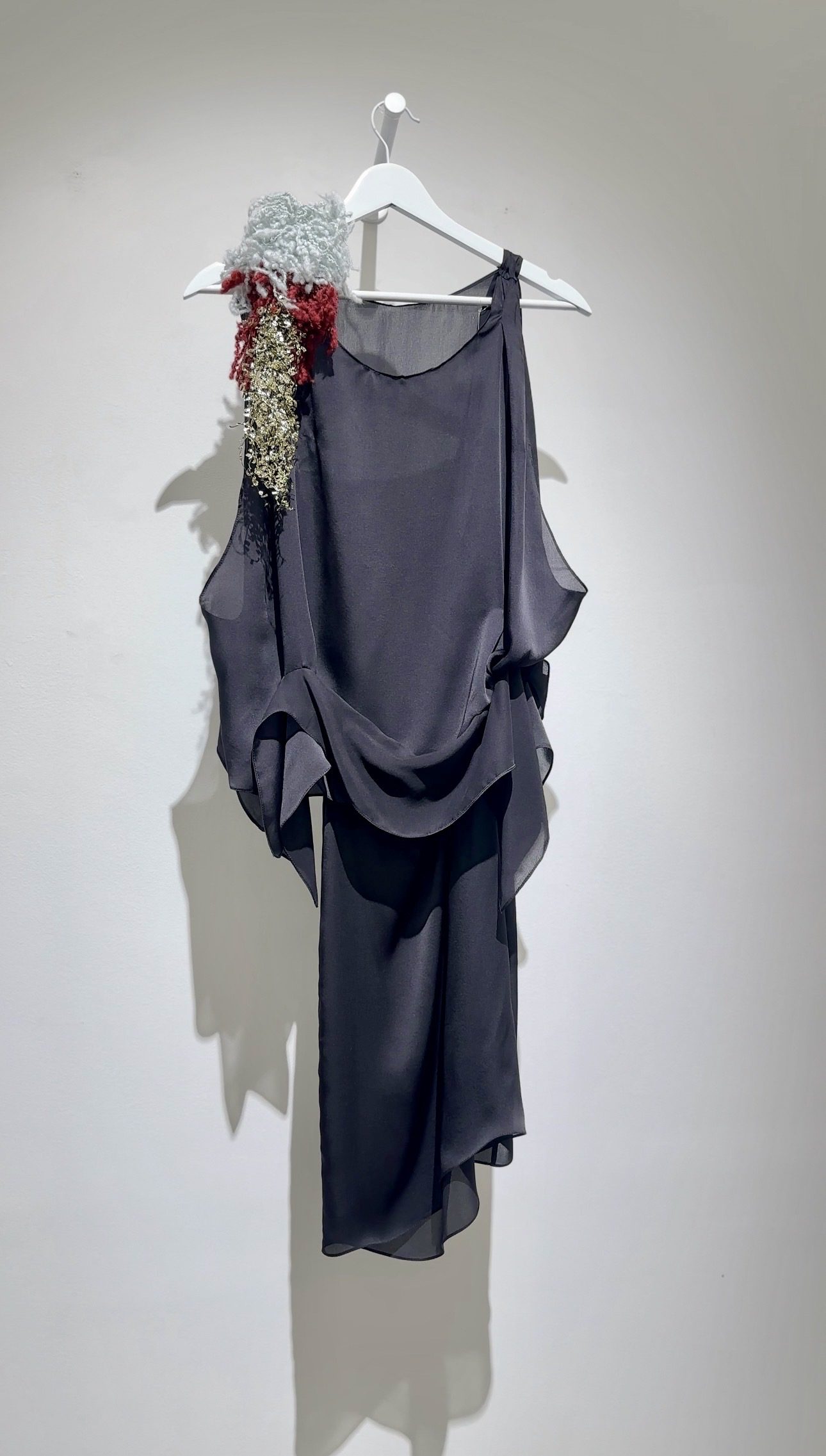 La collection AW26 s’appuie sur des matières nobles sourcées de façon responsable — velours, tweed, chiffon, organza, pour la plupart des stocks dormants. La broderie, motif central de la saison, n’est pas un ornement posé sur un tissu : elle en est la structure même. Elle garde sa douceur, son drapé, son poids. Un mélange de mouvement et de densité simultanés.