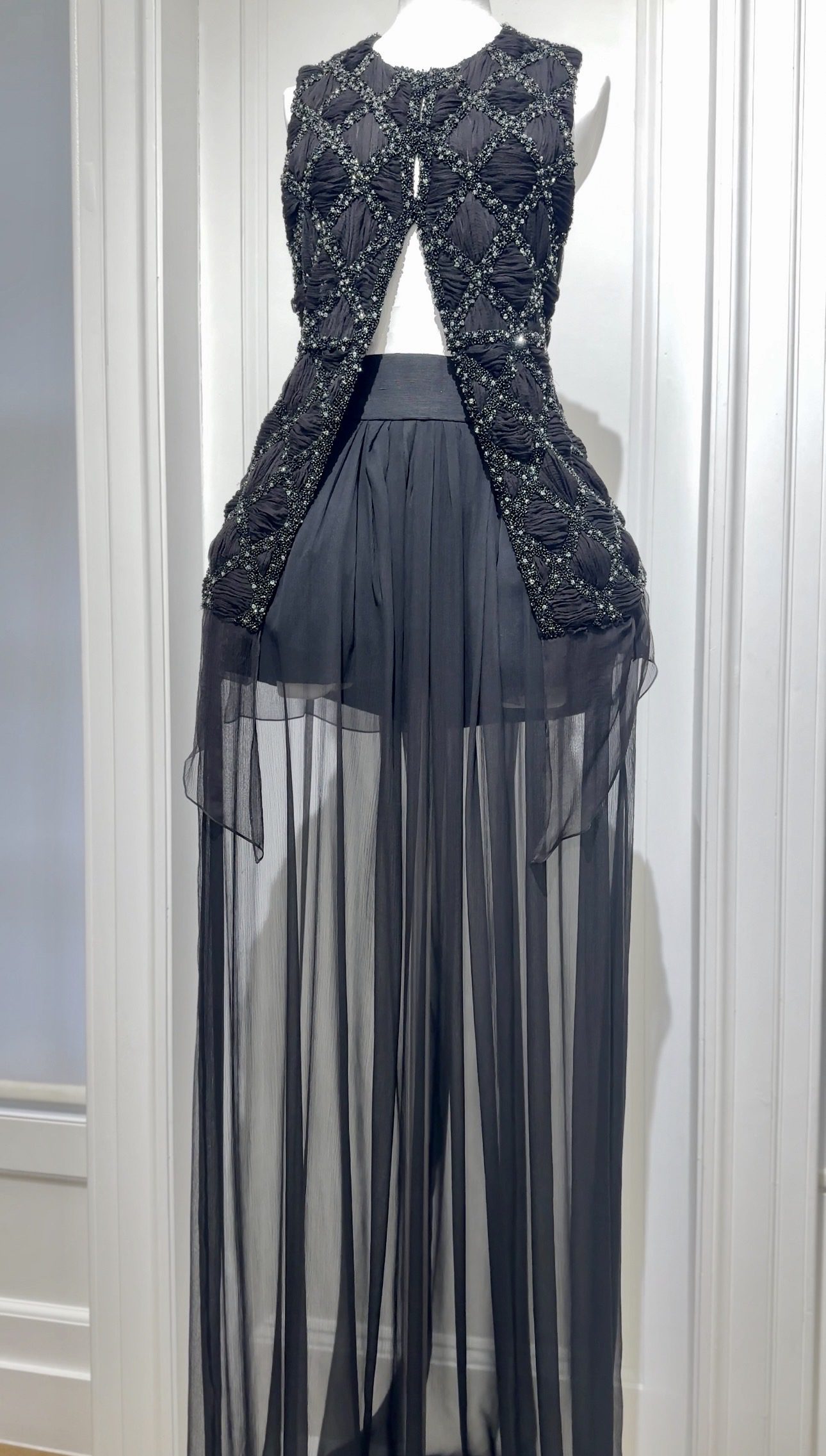 Cette dualité irrigue chaque look de la collection. La saison débute avec des vestes au col étroit, d’inspiration masculine indienne — des pièces strictes, architecturées, qui se rapportent à la masculinité, à ce qu’on emprunte au vestiaire masculin. Puis le vestiaire s’ouvre, se détend, laisse entrer la légèreté : des drapés souples, des broderies en relief, des transparences maîtrisées. Ce n’est pas l’un contre l’autre. C’est l’un avec l’autre, toujours.